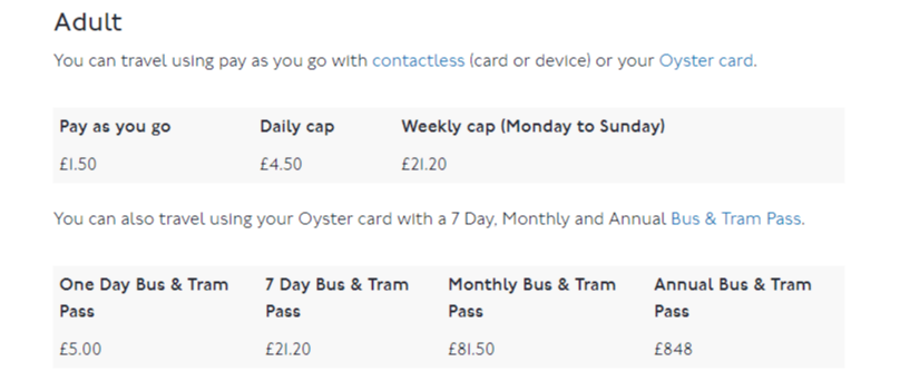 zone 1의 경우 성인 편도 £2.40 (다른 존으로 이동시 피크타임엔 조금 더 비싸다. 월~금, 오전 6시 반~9시 반/ 오후 4시~7시)